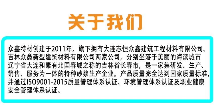 大連志恒眾鑫專業生產銷售風電灌漿料,強度80Mpa,100Mpa,110Mpa,適用二次灌漿,設備基礎灌漿,我們是大連灌漿料廠家,長春灌漿料廠家,有環氧砂漿,套筒灌漿料,PC座漿料、自流平砂漿等50多種產品,可滿足您不同需求,有任何技術難題歡迎來電咨詢:400-0411-552  眾鑫特材期待您的光臨!